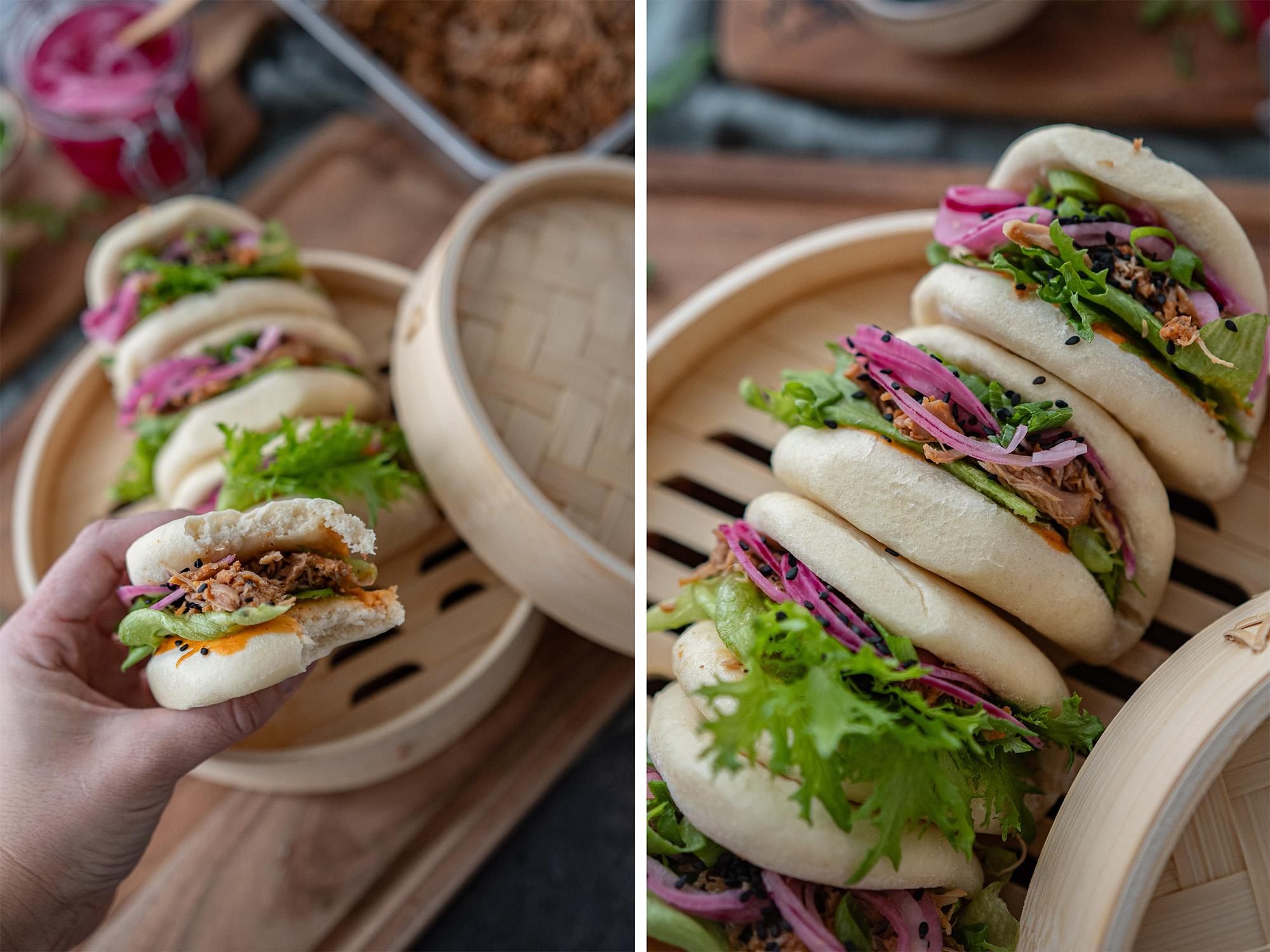 - Monter hver bao bun med chilimajones, crispisalat, pulled pork, syltet rødløk, vårløk og sesamfrø.